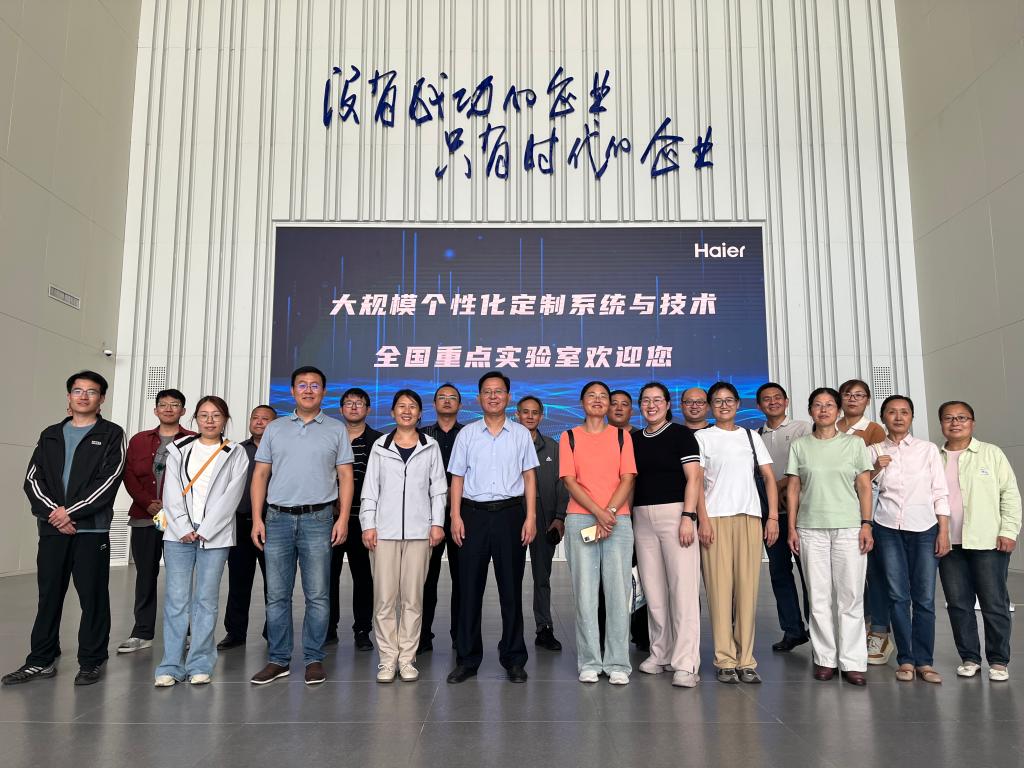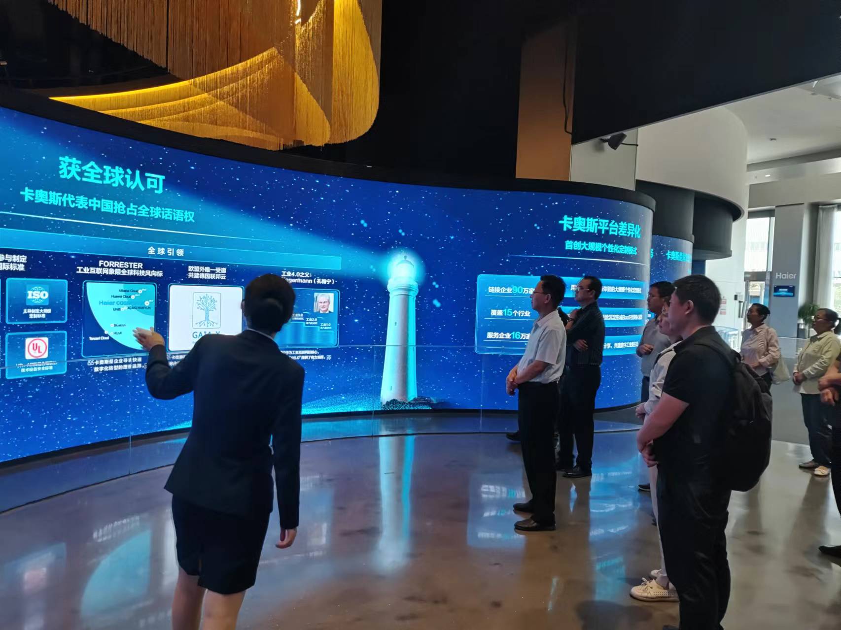 在卡奥斯工业智能研究院智能+5G大规模定制虚实融合示范验证平台,技术人员向大家详细介绍了该智能制造产线中涉及的工业机器人、视觉检测、智能运输、智能仓储、数字孪生、工业网络等先进制造技术知识,并指导大家在该产线完成了洗衣机模型的个性化定制、装配、检测、包装、入库。在卡奥斯生态体验中心,讲解员详细介绍了卡奥斯在工业生产、城市治理、经济提升等方面数字化赋能、工业互联赋能案例,讲述了海尔引领先进制造、跨行业赋能食品饮料光纤等企业建立灯塔工厂历程,展示了以用户体验为中心的大规模个性化定制系统与技术取得的巨大成就。通过参观,大家对智能制造产线建设有了较为清晰的目标,对其在人才培养中的支撑作用有了更加深刻的认识。